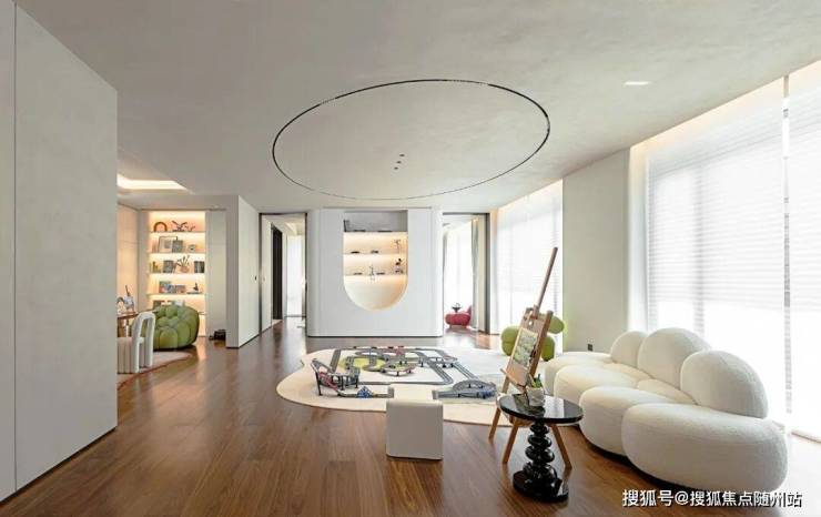 这套装修示意空间建筑面积约500㎡,每层都是无柱化设计,南北通透。拥有约16.8米超大南向面宽,首层层高约4米,2-3层层高约3.8米,整体空间有种“独栋气场”。