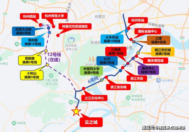 云之城位于建的地铁12号线首发站,未来将快速连接城西、未科、西站枢纽等热门板块,并通过与6号线在美院象山丝滑的同台换乘,可快速到达滨江、奥体、富阳、东站枢纽等核心区域,整条十字交叉的地铁线网上,共有8条地铁线换乘,通达全城。