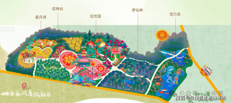五大主题区:花神殿+漫花田+忘忧国+梦仙林+芙蓉岛