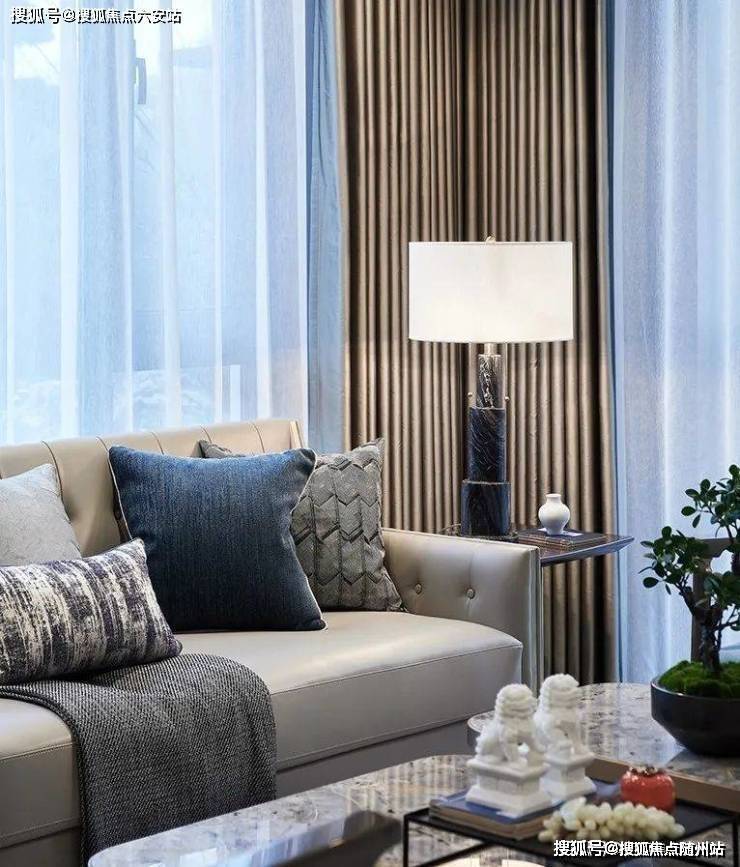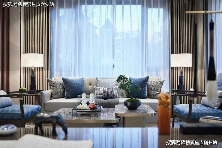 走入空间,可见水纹的柔美点染于软包、画饰、地毯等软装上,渲染出怡人舒适的空间氛围。三扇大面积玻璃门窗,将四时风光纳入框景中,邀人坐看自然的生机、时间的足痕。