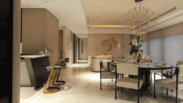 同时打破固有模块化布局,将客厅、餐厅、书房、阳台整体打造成联通又可随意调整的百变空间,让都市新贵无拘的想法能够一一实现。
