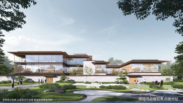 宋风坡屋顶勾勒天际线,宽屏玻璃幕墙倒映湖光;