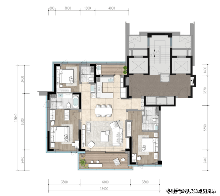建面约160㎡户型,把“实用”玩出“奢感”,两梯两户,三室配了三卫,居中的一体化餐客厅超懂生活,几乎所有空间都利用到了实处。