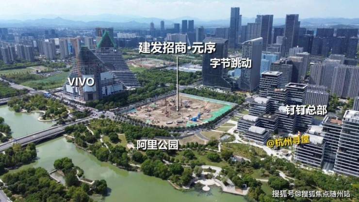 再看项目周边,东侧为钉钉总部,北侧为字节跳动华东中心,西侧为VIVO全球AI研发中心,南侧为河道和沿河阿里公园。