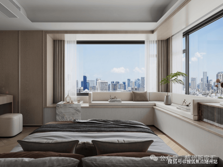 建面约103㎡明星边套户型,是目前市面上实用率最高的三房格局,得房率高达100%,绝对的“0公摊”,主卧竟然设计270°转角飘窗,通常只在市中心千万级豪宅中才会看到,是全杭州小户型中的唯一级了。