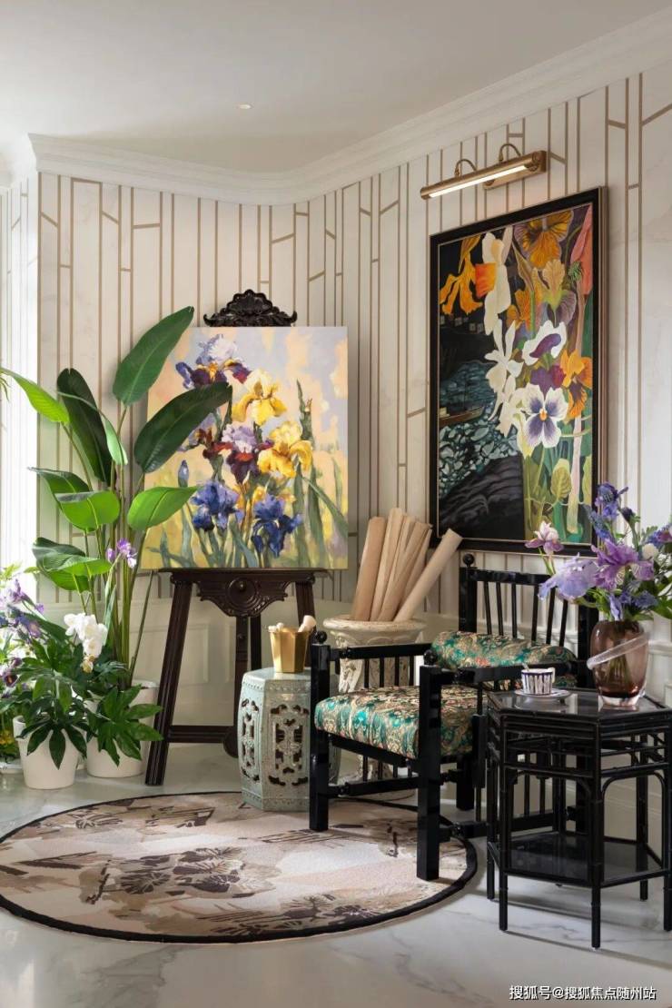 (建面约)315㎡边套做了四房三卫,巨大的餐客厅面宽约14.2m,足足停得下一辆大巴车,充沛的阳光倾泻在瑞彩祥云背景墙上,熠熠生辉。