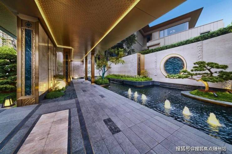 金色龙鳞祥云纹顶面和百达翡绿整面奢石景墙的涌泉水景,营造酒店式归家礼仪。
