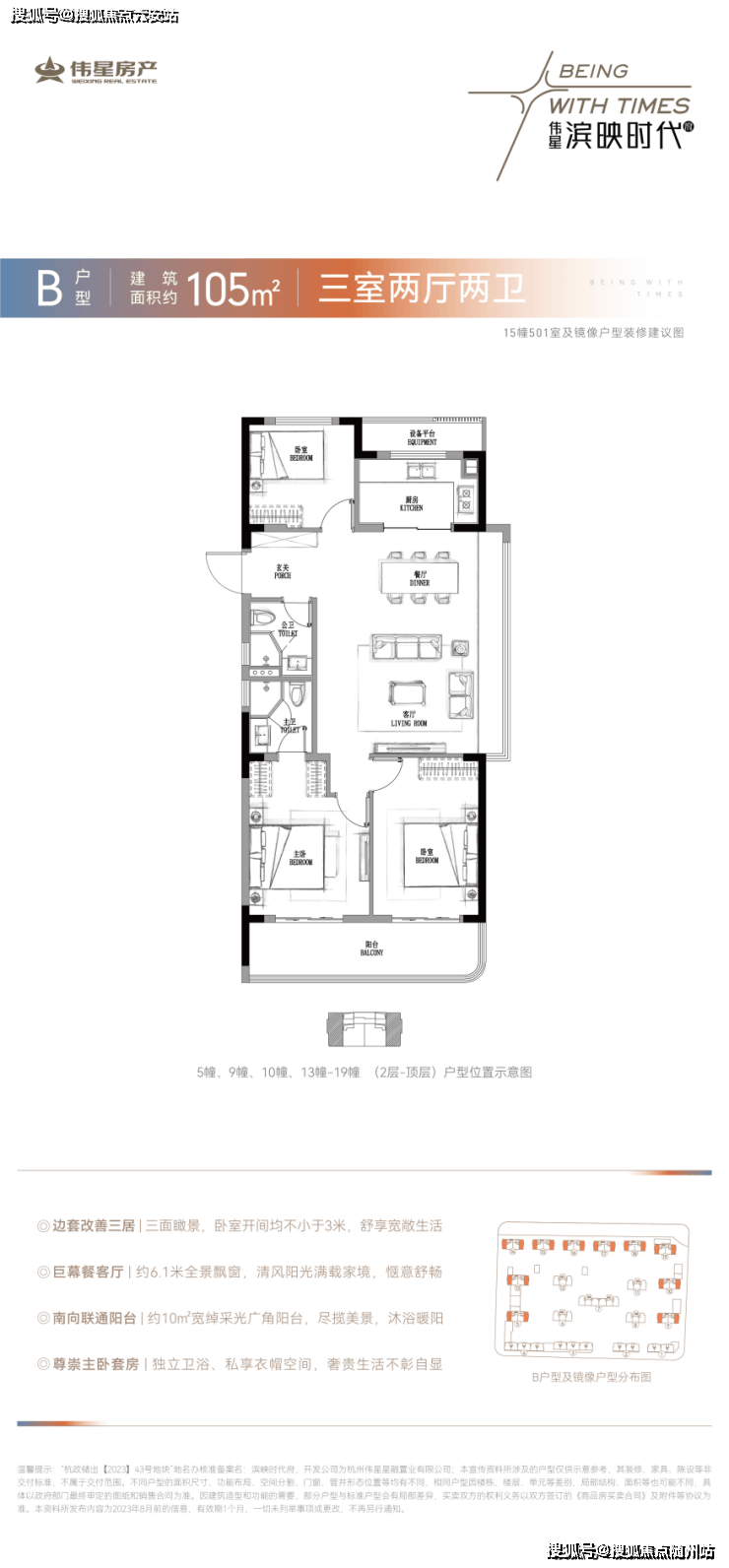 这款建面约105方进阶三居, 是目前市场罕见的阳光边套设计, 面宽约6.1米瞰景大露台和南向建面约10平方双联广角阳台,通风采光远超市场同类户型,舒适度拉满,很多小胖粉亲身体验过后,纷纷点赞。