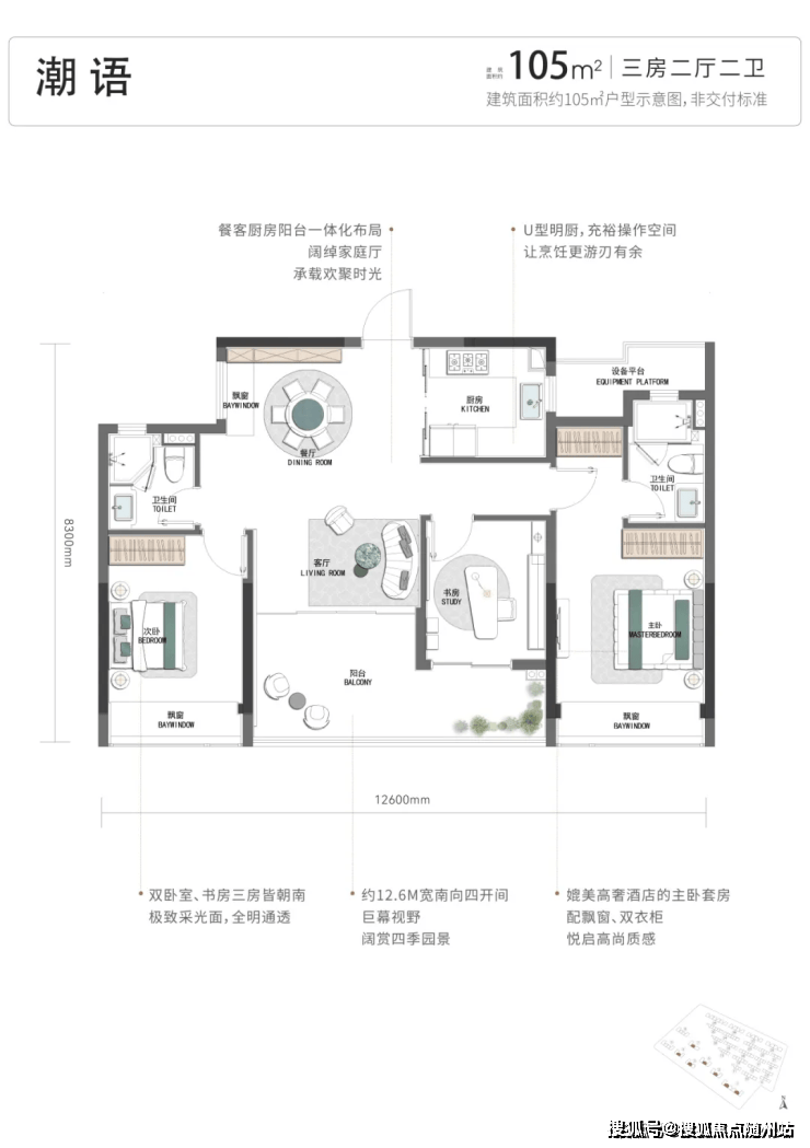 项目的户型起步就是四开间朝南的建面约105方三房:
