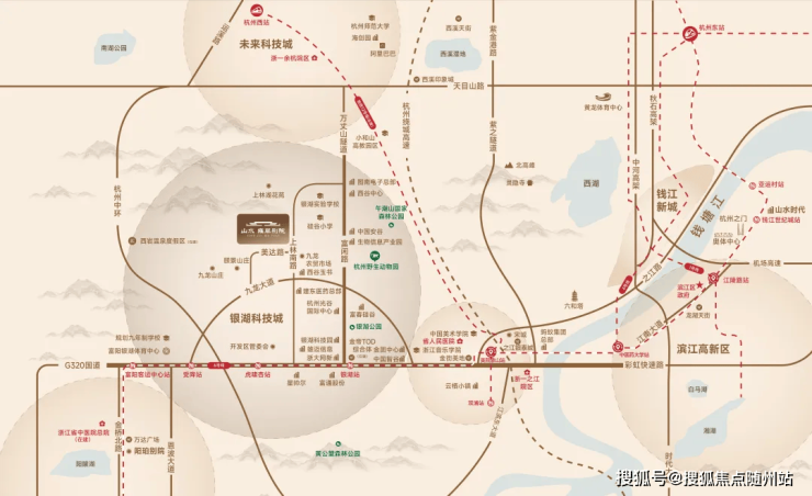 项目位于杭州“三江汇”战略核心区,北接滨江高新区,南邻富春江生态廊道,属银湖科技城融杭门户。背靠午潮山、黄公望森林公园,步行可达银湖公园,形成“三山两湖一江”生态闭环,日均负氧离子浓度超3000个/cm³,堪称城市“绿肺”。