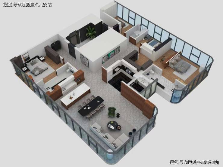 建面约310㎡户型实现“总裁办公室+会客厅+宴会厅+休憩室”多功能复合布局,双主卧套房设计,南向双阳台(6.4米)及景观飘窗,打造美术馆级陈列空间。