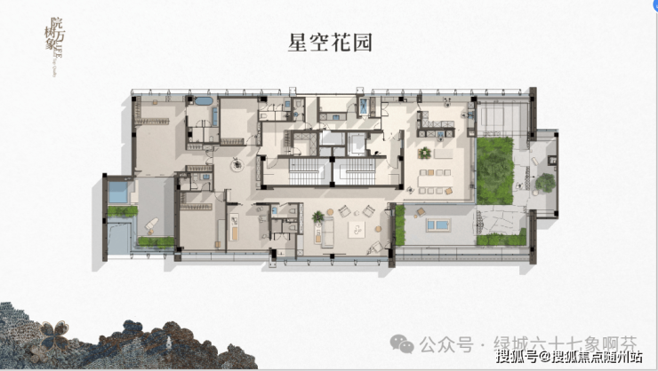 “星空花园”是一次关于空间与自然关系的哲学表达。设计师吴滨以“空中合院”为核心理念,打破传统大平层的平面逻辑,打造东西双露台、约150-190㎡花园空间,形成立体的自然环绕。