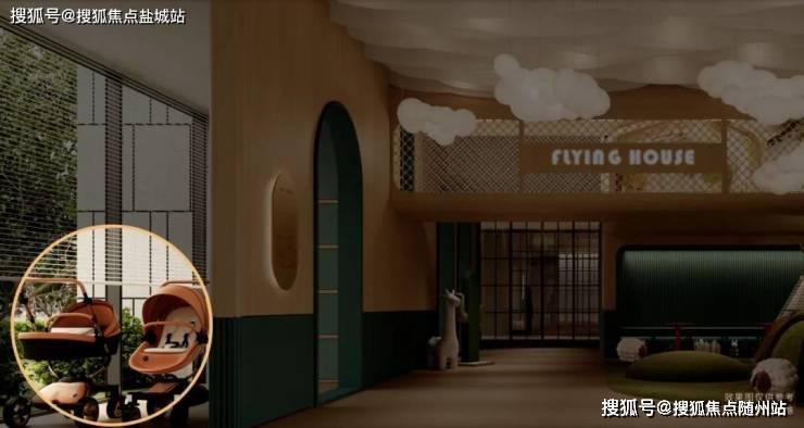 室内娱乐区以飞屋环游记为主题,门旁边有专门一块空间给孩子们放滑板车、儿童车、小背包,这实际上是要告诉他们,当整个空间变得更加的有序的时候,孩子们的情绪也会变得更加的愉悦、更加的稳定,这就是空间所营造的邻里共融。