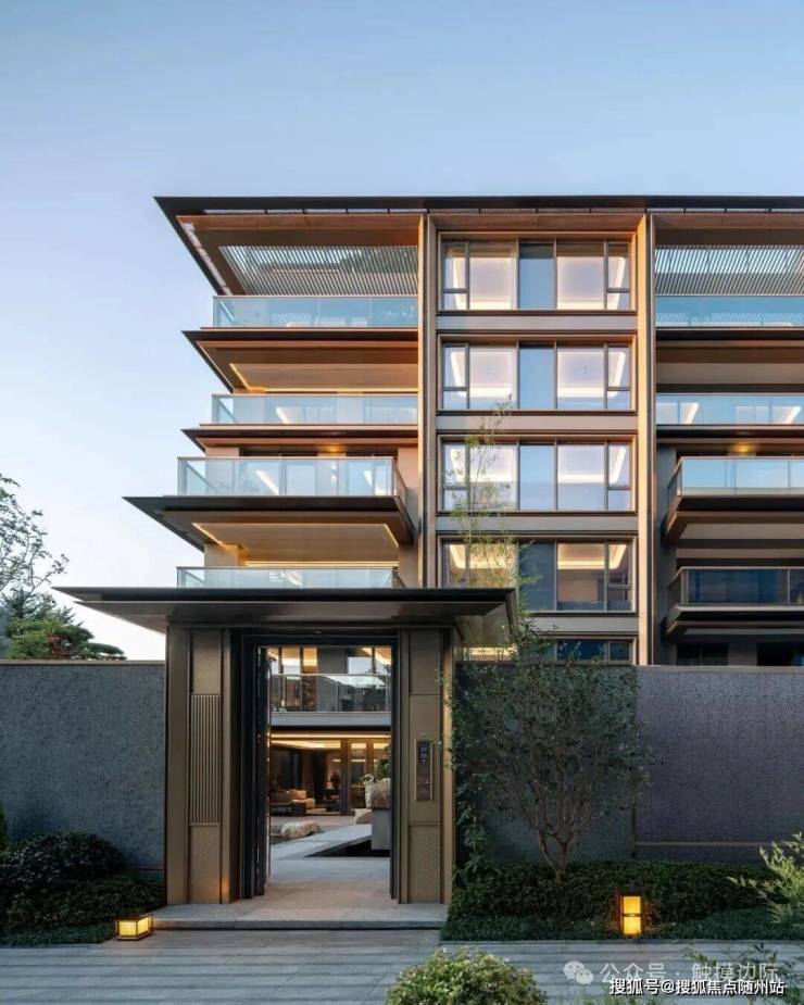 公区外立面取意于形、会意于神。设计师将住区主要入口以不对称的曲面坡顶统领全局,在捕捉宋代屋顶的灵动气韵的同时,亦暗合钱塘江潮的韵律。提炼中式建筑椽头、山花等元素,以现代设计语言重构,纤毫毕现。既延续传统形制意趣,又赋予其现代建筑的简洁张力。