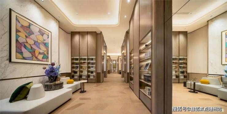 门头「高、阔、深」,高度约9.5米,宽度约66米,深度就像一座小广场,门口的奢石、水景,头顶的透光云石,都是Plus版。
