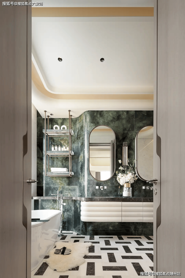 而且从水刀拼花的奢石地面、原石雕琢的墙面,到“亭台楼榭”感的悬浮空间,以及和墙面纹样一致的电梯厅荷叶纹,目光所及,是一种更轻盈的奢感。