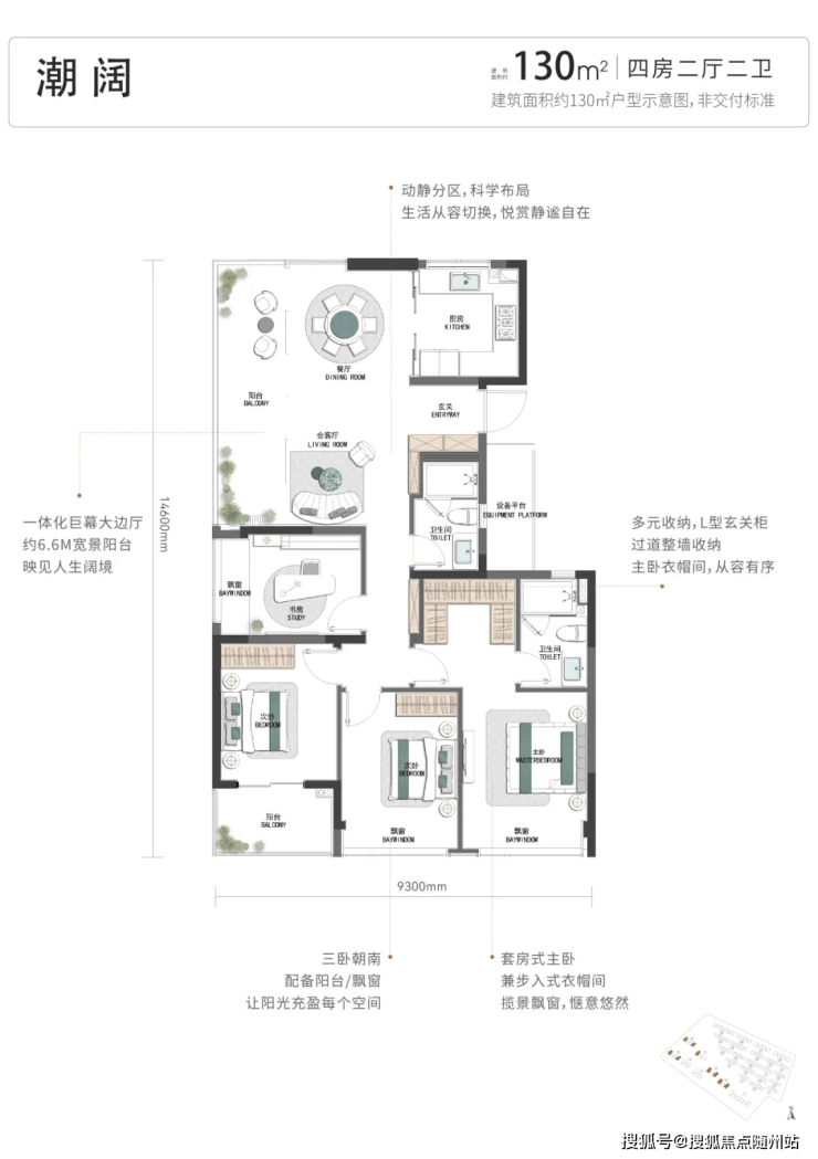 空间魔法设计:12.6米四开间朝南、全飘窗设计、270°环幕景观,实现空间效能最大化。