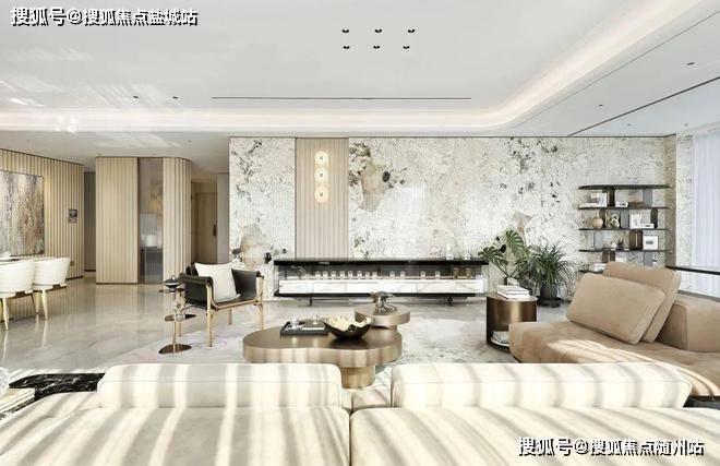 而李嘉诚御用设计师梁景华的390m²正厅,电视背景墙是意大利潘多拉奢石,甚至延伸到了空中花园,像是飞舞在皑皑雪山中的霓虹霞衣,在皓白的雪花上勾勒出写意的纹理,灿若繁星。