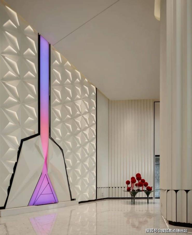 步入挑高约11米的一楼大堂,折线通高墙面与钻石切割前台 ,像极了兰博基尼发动机的散热鳍,又似来到澳门七星级酒店摩珀斯。