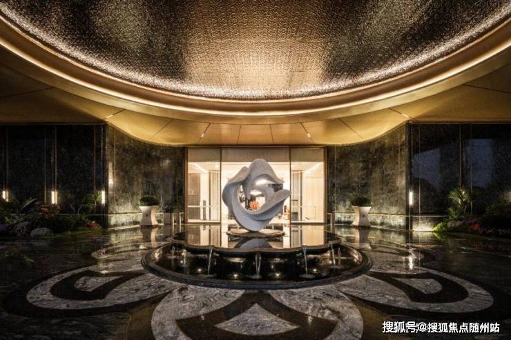 最具仪式感的应该是大门入口处:宽约35米、高约6.5米的寰宇云厅,如殿堂一般气势恢宏,两侧还有挪威蓝翡翠石材景墙对仗而立。