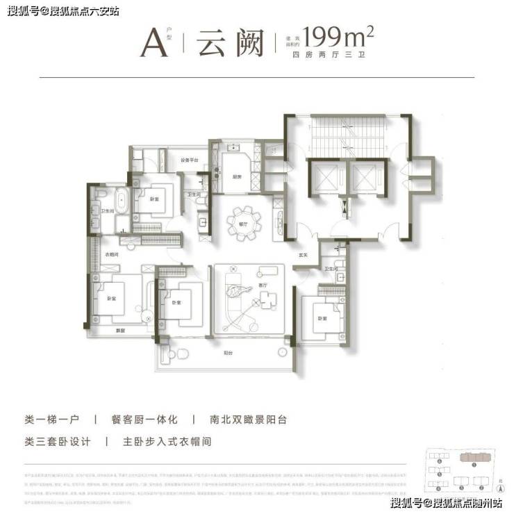 主力建面约199㎡户型采用四房三卫双套房设计,南向面宽约16米,三卧朝南,配备约7.2米跑道式阳台与独立玄关。类一梯一户配置带来约12㎡专属电梯厅,得房率85%-86%,LDKB一体化设计增强空间互动性,北阳台兼顾洗烘与观景功能,实现“三套房”朝南的实用布局。