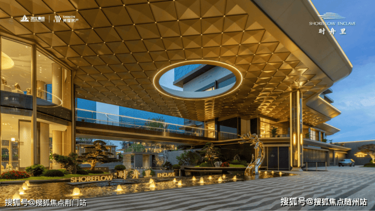 GAD大师张微以“科技+生态”为设计理念,将未来感弧线融入城市肌理:70米宽、9米高的鎏金天幕入口采用偏置大堂设计,顶部圆形镂空让光线穿透,将社区立体花园与城市界面自然衔接,形成“你站在桥上看风景”的互动美学。