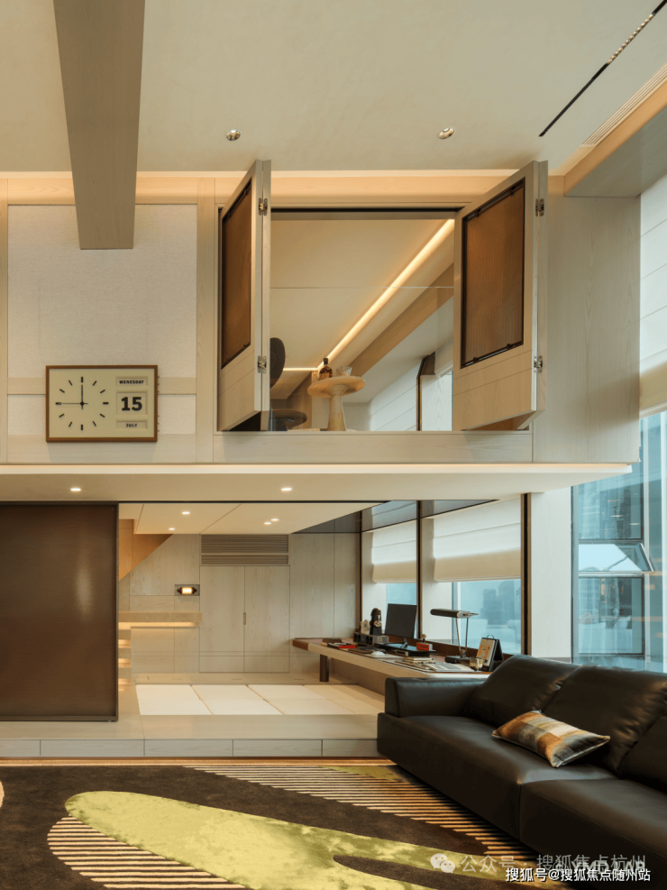 沿悬浮楼梯拾级而上,则抵达完全私密的 「双雅憩空间」。这里是与自我深度对话的领地,是安放热忱与灵感的阁楼。一面是沉浸式的「松弛空间」,另一面是功能完备的休憩领域,可开可合。