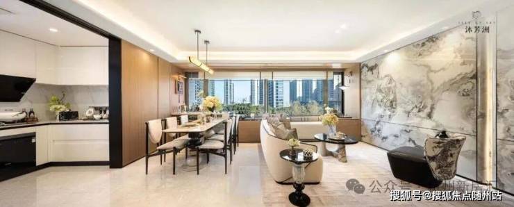 室内精装方面,沐芳洲对标兴耀M55系列,从地面瓷砖铺装、岩板背景墙,到日立空调、菲斯曼地暖等一线国际大牌皆一一落实。