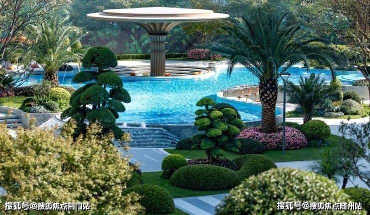 滨江经典的热带园林景观,种满了高大的热带树种;除了下沉式庭院中的水景外,园区中央还有一座异形景观水池。