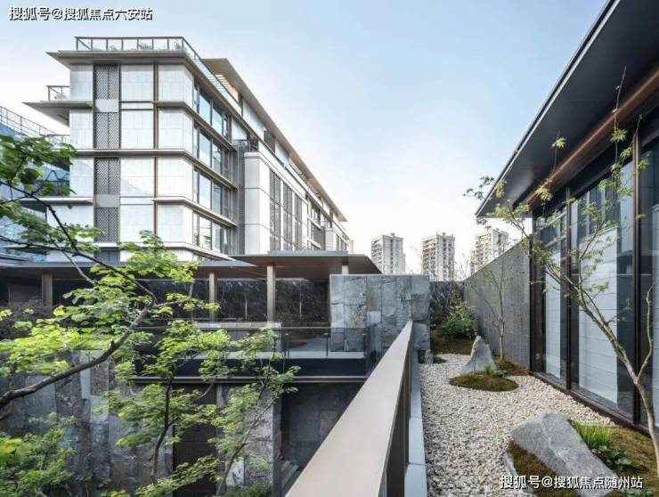 会所入口还采用了和观雲钱塘同款的柏坡黄石材打造迎宾景观,与罗汉松互相映衬。进入示范区后,古朴雅致的下沉式庭院便豁然眼前。昂贵的黑松和羽毛枫分立两侧,四角是设计师精挑细选的乌桕树,中间叠水曲折辗转,宛若自然秘境。