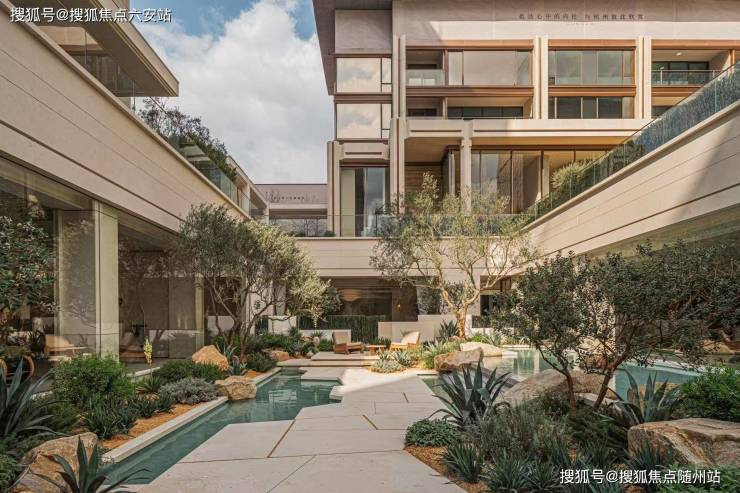 园林以蓝调泳池、莱姆石铺装、旱生植物为核心元素,复制地中海沿岸的松弛感。景观节点嵌入休憩平台,促进邻里互动。