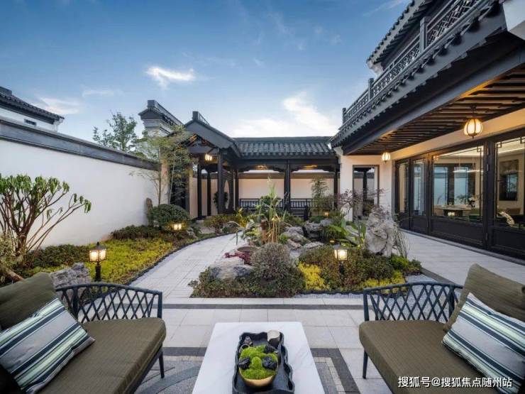 三进十景:中央水景轴串联月洞门、雕花漏窗,移植百年樟树、红枫。