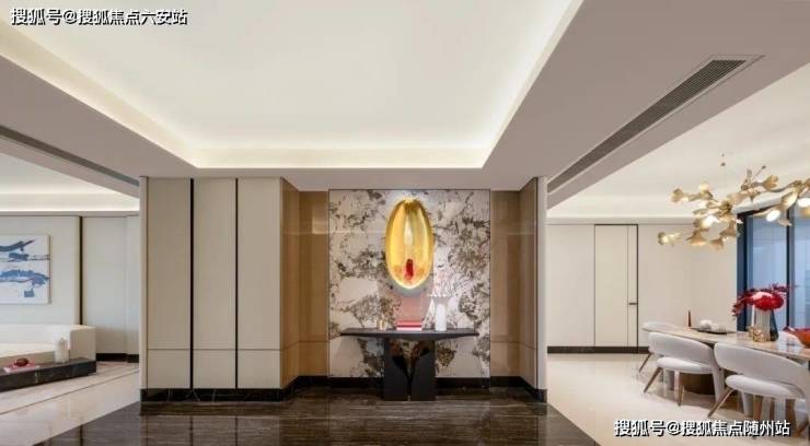 项目在细节处理上尤为用心,如玄关处整面渐变曲面艺术玻璃,映射若隐若现的江景;客厅中,钱塘江的柔美曲线融入弧形吊顶与奢石拼花。这些细节体现了设计师对美学的深刻理解。