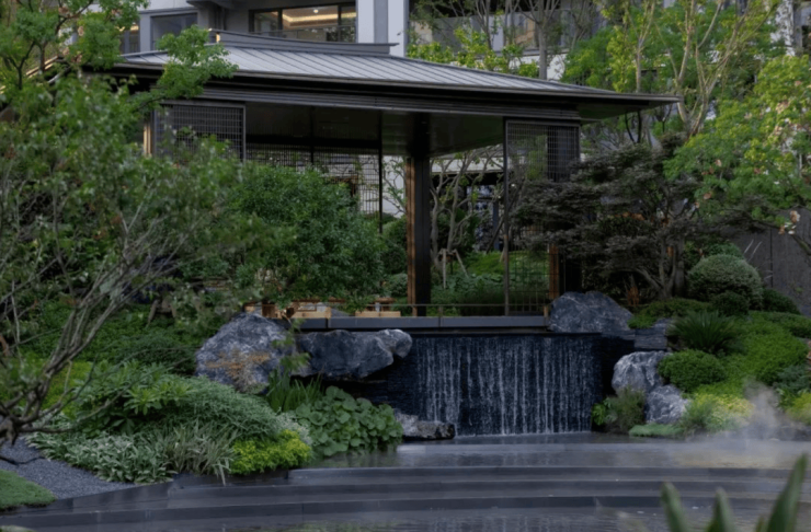 中轴“壶中天地”:主入口门厅→高定会所→下沉山水庭院,取水入园营造东方风骨叠境,山水成回家纽带;