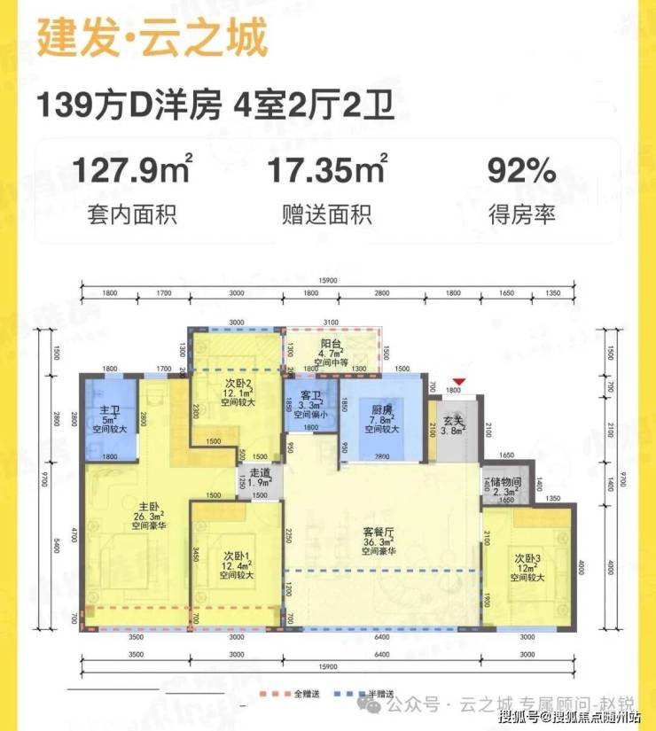 整体容积率约1.01-1.3,规划南北两大住区:北区4幢10层洋房、12幢4-6层的叠拼(约188㎡叠墅)南区24栋8-11层洋房(建面约91-165㎡洋房)云之城做了封闭阳台,得房率最高能达到96%。全T2分布户型,放眼整个市场,这样的得房率绝对是名列前茅。建面约91方真三房户型,真南北通透洋房产品北侧无消防连廊设计,小面积也是真南北通透,区别市面2+ 1户型,最小的卧室也有将近9个平方,每个卧室面宽均达到3米及以上