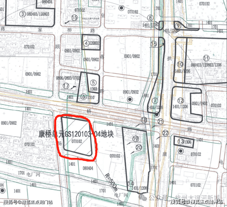 规划图还公布了地块周边500米范围内的市政设施图,地块北侧,未来规划为康良快速路,可以看到应该是地下快速路隧道口,就位于顾阳路与康桥路交叉口;
