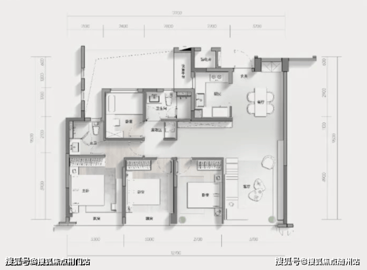 139㎡户型配置更为成熟,南向双套房设计、270°L型飘窗主卧、三卫布局等,满足多口之家尤其是三代同堂的需求。