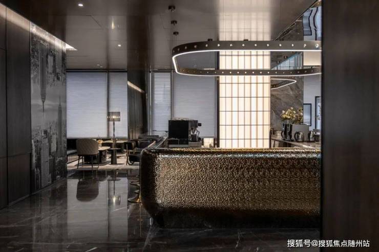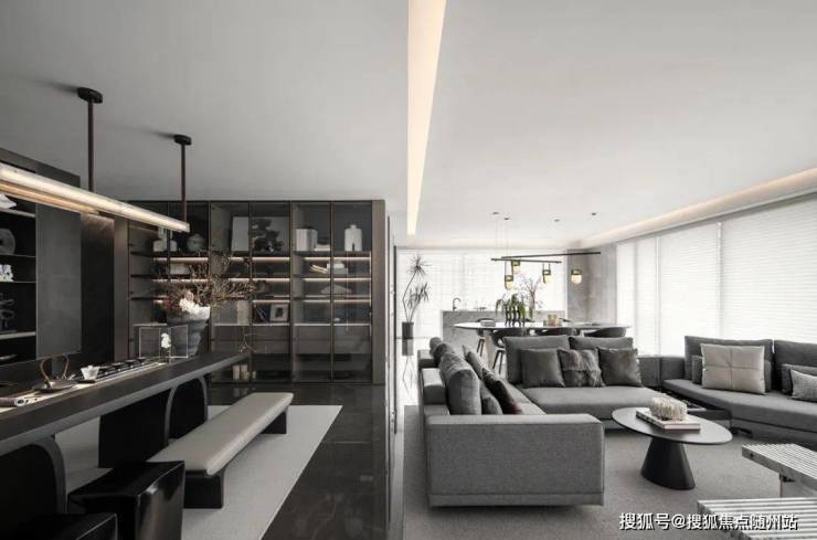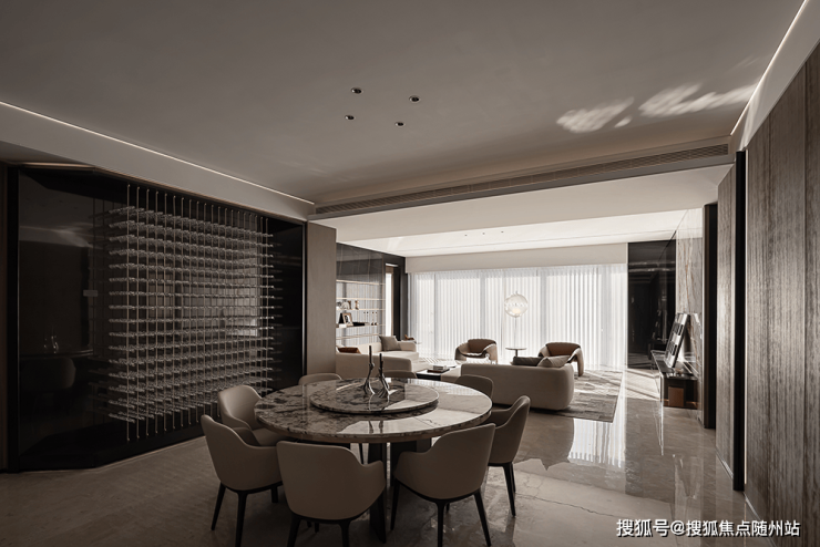 作为杭州最早的大型居住区之一,在首层入户大厅公区,以钛金板+背景墙石材+木格栅的组合,延续着宝格丽一贯富有格调的装修风格。唐忠汉先生非常倡导场域中心论,他通过LDK一体化设计新趋势,让整个开放空间形成了室内的场域中心,尽享景观视野的同时,也就是社交空间。