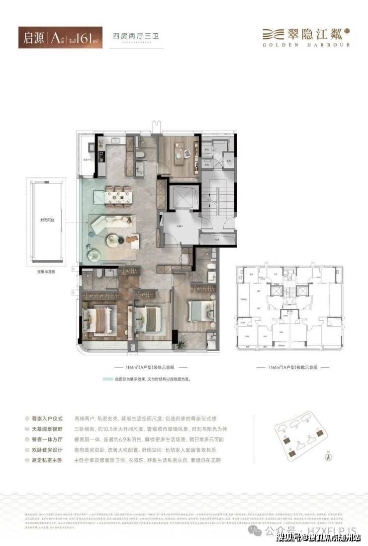 在杭州目前新房市场中,使用率能真正做到约90%的楼盘,凤毛麟角。翠隐江粼轩通过封闭阳台只算半面积+电梯厅空间转化(公区),实现使用率最大化。建筑面积约230㎡户型更是做到了近66㎡客餐厅+双套房布局,空间感媲美很多二手老豪宅的260㎡。