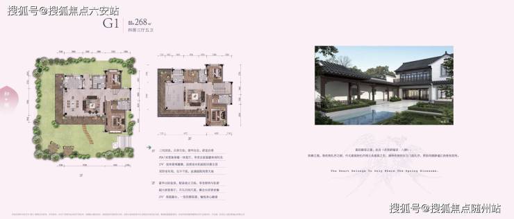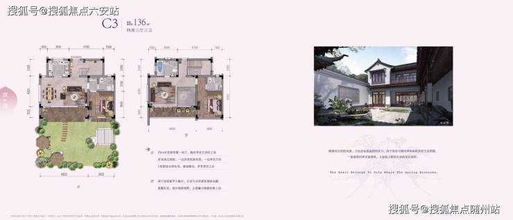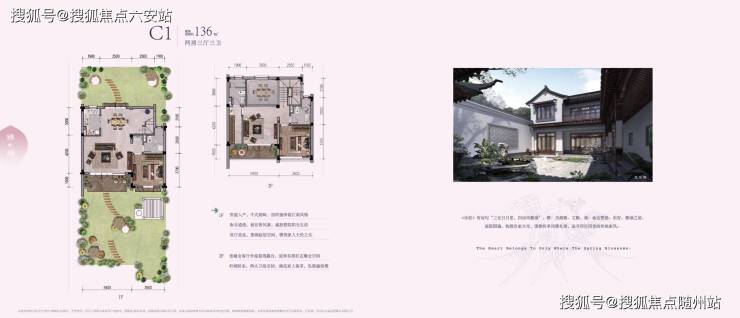 建筑采用粉墙黛瓦、庭院深深等传统元素,结合现代大开间、短进深设计,打造纯中式别墅社区,联排别墅层高6.6米,配备私家停车位及合围式庭院。