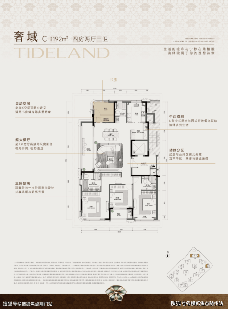 户型亮点:160㎡户型采用横厅布局,三卧室朝南,配备独立家政阳台;192㎡户型设中西双厨,双套房设计,书房270°采光。