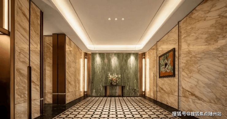 比如各种各样的石材,在锦上观澜的入户大堂、单元大堂的墙面和地面,你是看不到砖的,基本都是奢石,各种石材、各种拼花。哪怕是到了139方类一梯一户,每家门口的独立电梯厅里,一样用的是石材。