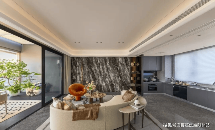 5F为赠送的大尺度露台达到约72㎡,在结构上也具备了未来业主可改造的空间。比如展示样板房改造成了一个偌大无比的超级阳光房,将下午茶、阳光书房、撸猫等未来生活场景功能全部展示了出来。