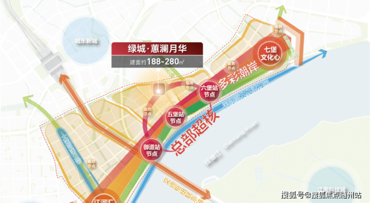 约800米直达规划连堡丰城地下商业带。高阶生活场景则依托2.5公里辐射圈内的杭州IFC——全球第四座金融中心正重塑江岸,未来奢侈品旗舰、艺术展览、摩天轮滨江社交场将定义塔尖消费方式;同时,成熟顶流配套依然在握: 向西3公里坐拥万象城、来福士24小时繁华场,加上在建的五堡TOD烟火气街区,形成"下楼买菜、一刻钟会客、半小时赴宴"的分阶消费链。