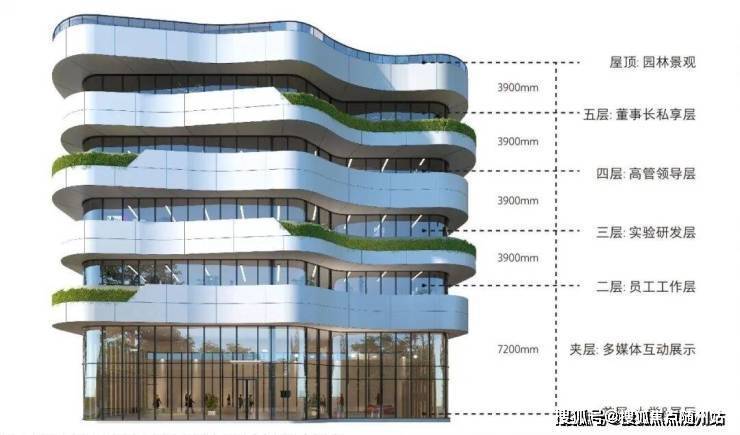 立体生态空间:360°环形采光阳台环绕建筑,屋顶露台与退台式绿化形成“空中花园”,推窗即景的设计将自然光线与绿植引入办公区,研究表明自然光照可提升20%以上员工工作效率。