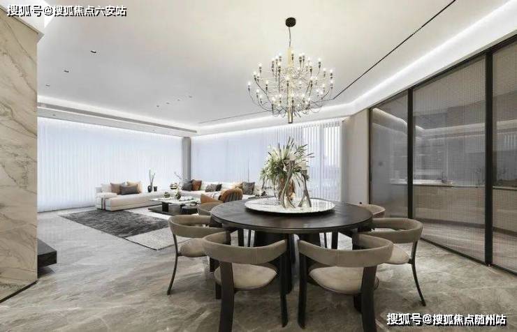 335方正厅最为亮眼的就是大尺度的餐客厅、大开大合的茶室空间、中西厨设计,