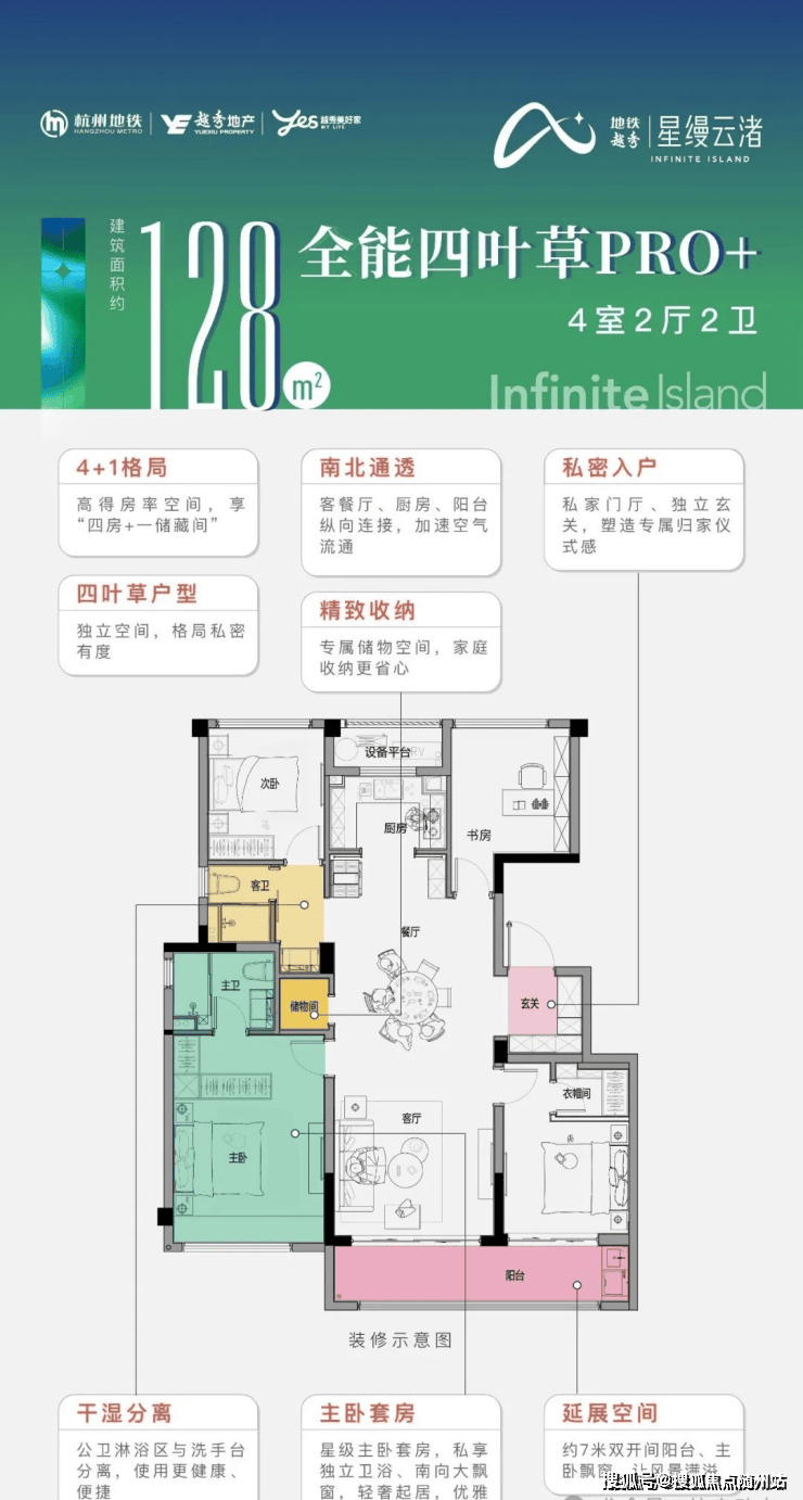 建面约128㎡户型为四房两厅两卫,该户型大亮点是超高的得房率,也是受市场欢迎的“四叶草”户型,四个卧室互不打扰,充分保证后期的生活隐私。户型尺度上也同样阔绰,近7米的双开间阳台,2.7m宽的U型厨房,每一个小空间内都可以承载很多的生活场景。