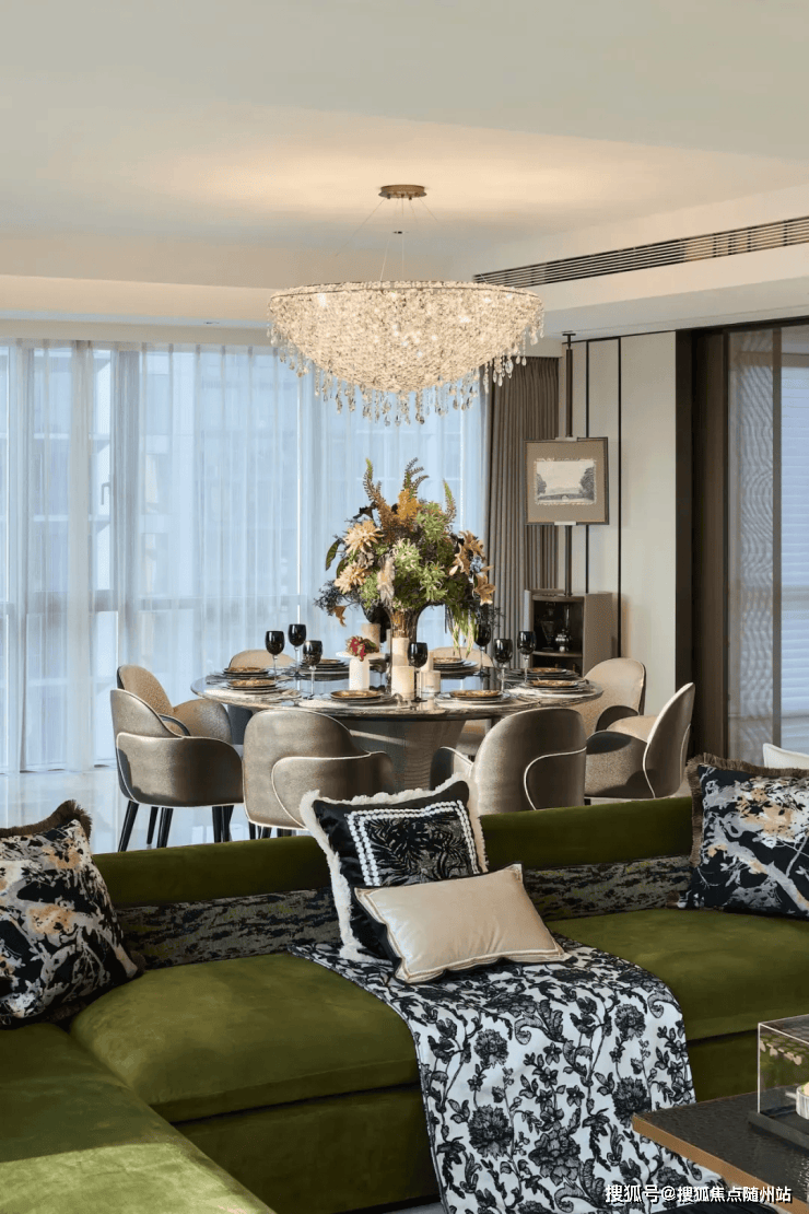 草绿色的沙发勾勒出大草原的意境,品牌茶几和玄关的桌子呼应。优雅的地毯勾勒出会客厅的核心区域,不同的座椅增加对话场景。海派的融合力量下,丰富的艺术元素巧妙衔接,丰富的细节彰显奢华。多元化的设计主题下,增加社交和品鉴的场景。