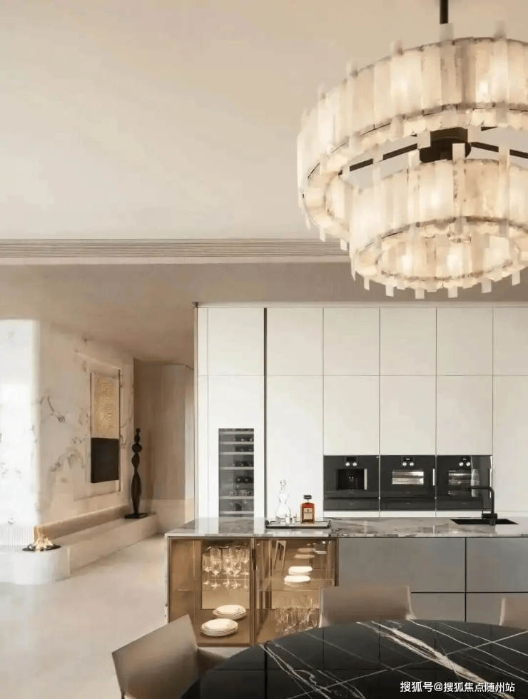 88方的超大客餐厅,270度瞰景视野,19米的双面采光,更有纯粹娱乐的超大互动空间。开放式西厨区、餐厅、客厅通透相连,开阔的岛台后侧,嘉格纳200系列蒸烤箱、咖啡机与抽屉组合一字型排列,无缝平嵌入暖白色橱柜。