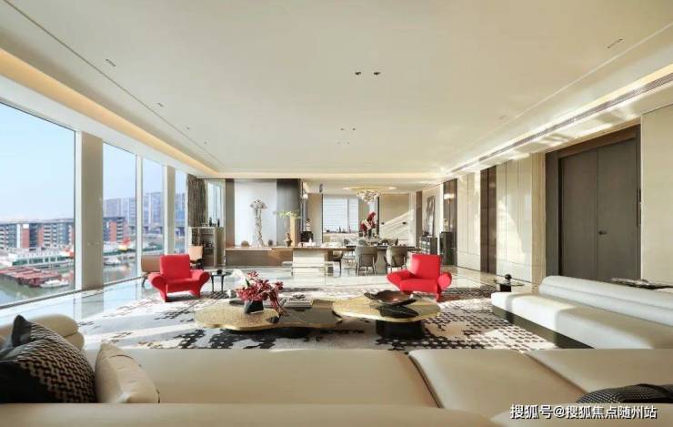 携手国际顶尖团队Gad、李建国等,以“悬浮水晶”为灵感,采用Low-E中空玻璃与阳极氧化铝板,打造建面约800㎡环幕大平层。外立面如流动的丝绸,与运河波光粼粼的倒影交织,形成“建筑即景观”的视觉奇观。